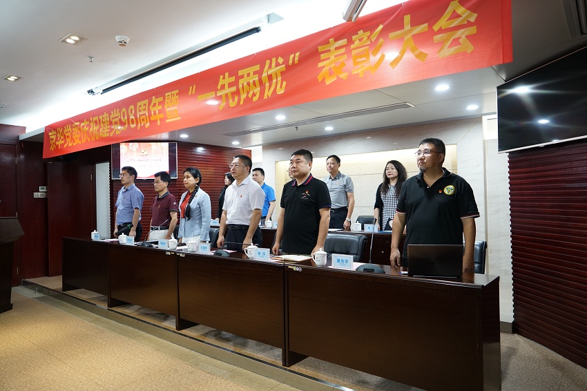 會議在莊嚴、神圣的《國歌》聲中開始。黨委委員、京華公司副總經理滕立軍宣讀“一先兩優”表彰文件;黨委書記陸毅萍、黨委副書記羅云水為獲獎人員頒獎;先進黨支部書記歐文剛、優秀黨員代表張藝涵發言;黨委委員、總會計師邢洋帶領全體黨員重溫入黨誓詞;王國慶總經理匯報公司上半年生產經營情況、梳理下半年工作計劃;京華信息公司總經理潘光宇分享5G概念介紹及商用領域的探討;黨委書記陸毅萍女士傳達中共中央關于在全黨范圍內開展”不忘初心,牢記使命”主題教育活動的精神。