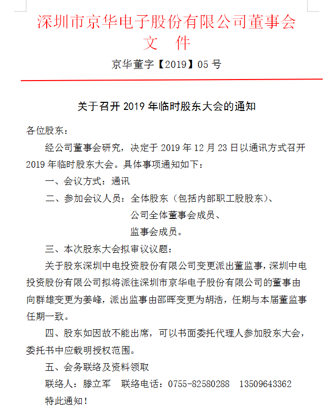 深圳市京華電子股份有限公司關于召開2019年度股東大會的通知