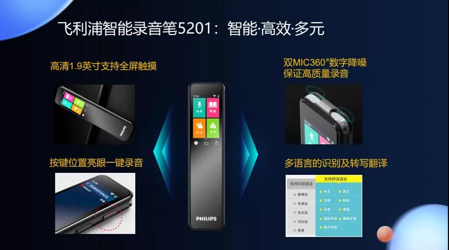 王賀率先介紹了京華和飛利浦聯(lián)合出品的錄音筆VTR5201,這款棒棒形態(tài)的錄音筆,無論是線上還是線下,絕對(duì)是一款爆品,至上市以來,就深受廣大消費(fèi)者的喜愛,VTR5201是一款結(jié)合AI語音智能的錄音筆,可識(shí)別多種語言,并能即時(shí)轉(zhuǎn)寫并翻譯,這顛覆了以往消費(fèi)者對(duì)棒棒形態(tài)單一錄音功能的概念。在硬件方面,配置也是非常出色,擁有1.9英寸的高清觸摸屏,雙MIC360度數(shù)字降噪技術(shù),當(dāng)然,還有非常實(shí)用的一鍵錄音功能。