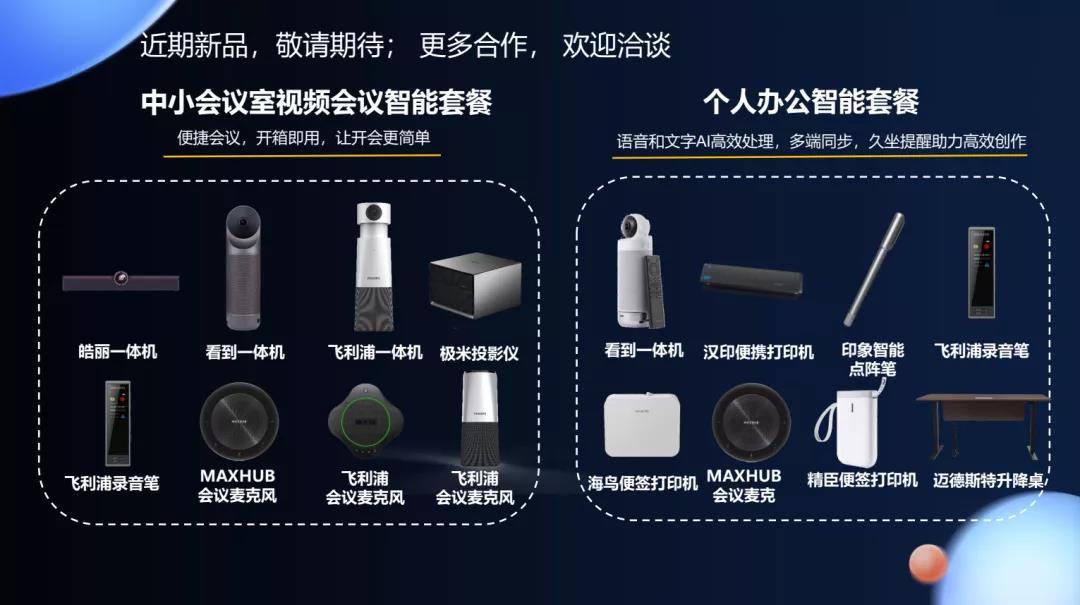 在峰會(huì)的最后,王賀介紹了京華&飛利浦最新的戰(zhàn)略合作品類:會(huì)議&個(gè)人視訊系列產(chǎn)品。我們相信與鴻蒙生態(tài)未來的合作中,音頻和視頻終端產(chǎn)品同樣重要。京華&飛利浦視訊設(shè)備軟硬一體解決方案,讓視訊會(huì)議更加簡(jiǎn)單便捷。同時(shí)加入更多智能元素,對(duì)語音和文字進(jìn)行AI高能處理。讓隔空會(huì)面,超越會(huì)面!