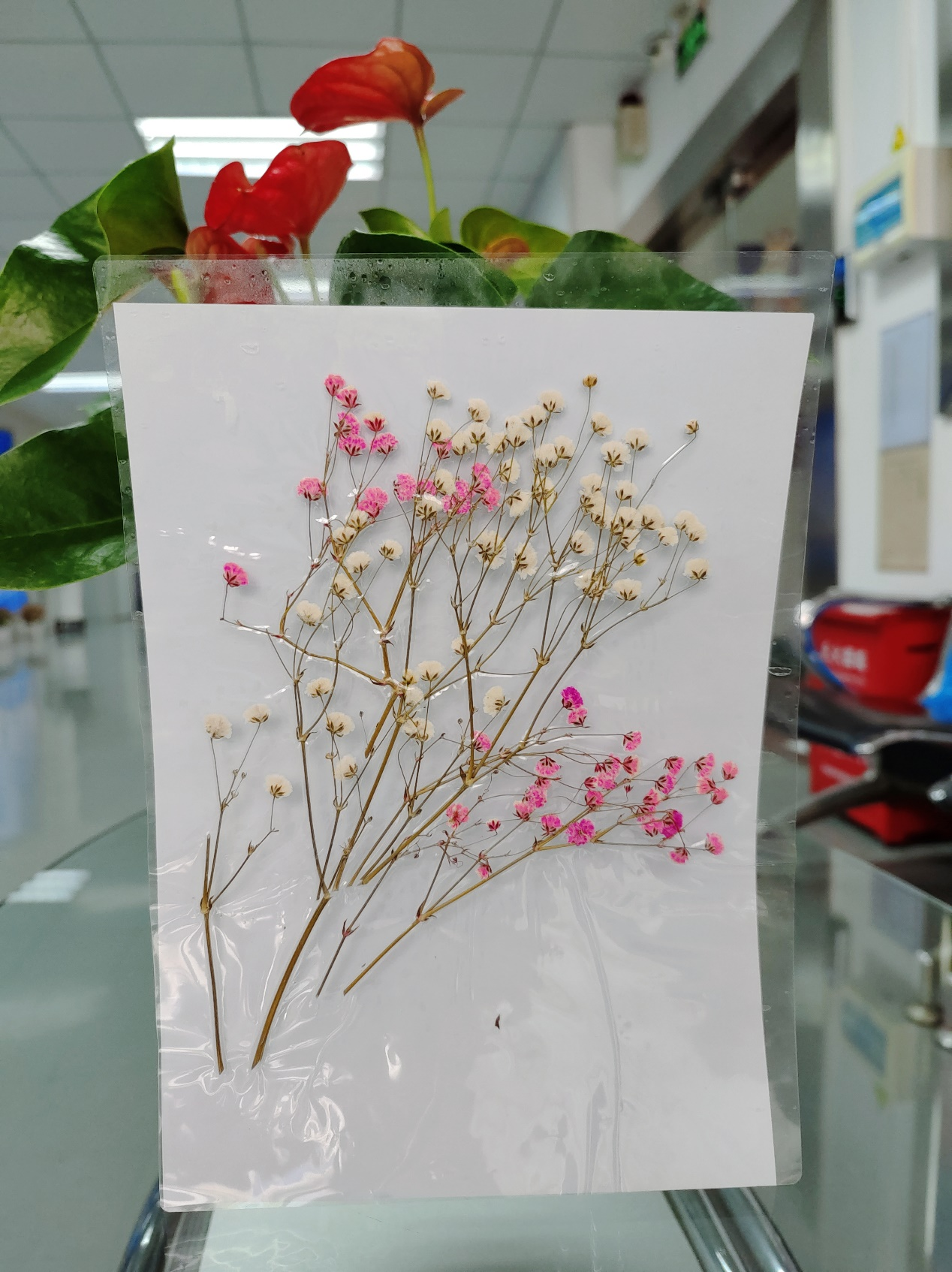 居家辦公時發現了角落里放置許久的滿天星,趁其還未干枯,決定通過按壓、過膠的形式將其拼湊成一幅畫永久保存。
