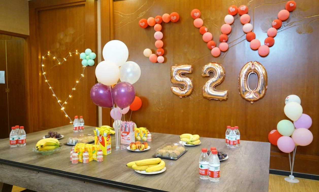 恰逢“520”這個特殊的日期,團建室被裝飾了許多色彩斑斕的氣球,室內閃耀著醒目的心形燈,墻上貼著“JW 520”,表達了員工對京華的認同感與歸屬感,整個沙龍會場顯得溫馨而又浪漫。