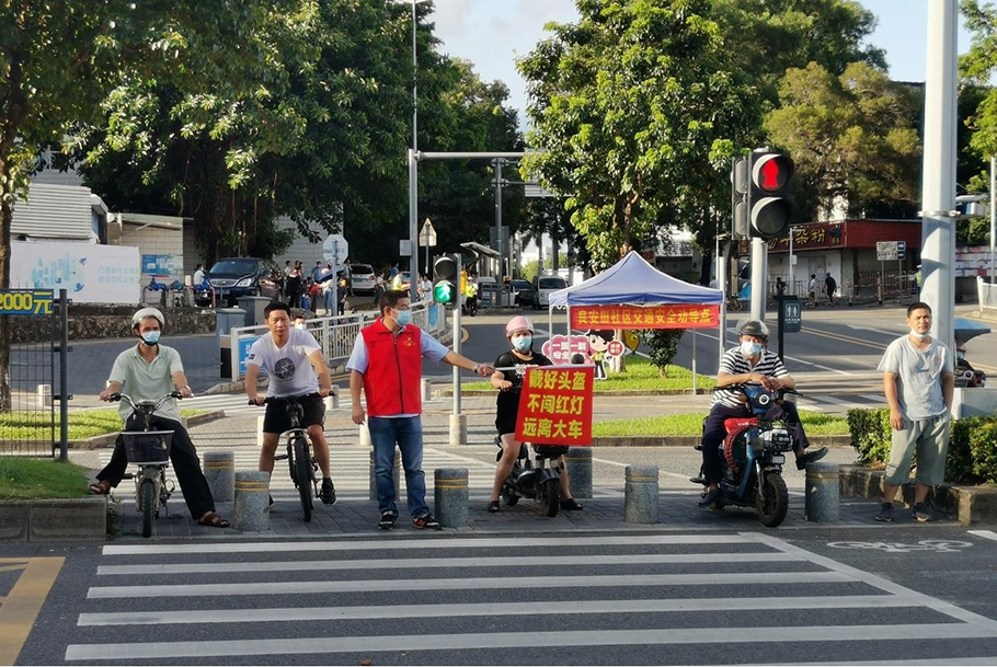另外,為豐富支部黨日活動(dòng),龍崗京華黨支部全體黨員參加良安田社區(qū)組織的“交通安全勸導(dǎo)”工作,在下班高鋒期(下午5:00-7:00)分組到道路交通繁忙的十字路口值勤,勸導(dǎo)未佩戴安全頭盔的電動(dòng)車駕駛?cè)舜魃项^盔,阻止行人闖紅燈、電單車和機(jī)動(dòng)車搶道等不遵守交通規(guī)則的行為。黨員志愿者頭頂高溫酷暑,堅(jiān)守在各個(gè)點(diǎn)位,耐心提醒行人遵守交通規(guī)則,用心用情為社區(qū)群眾撐起交通出行的“安全傘”。