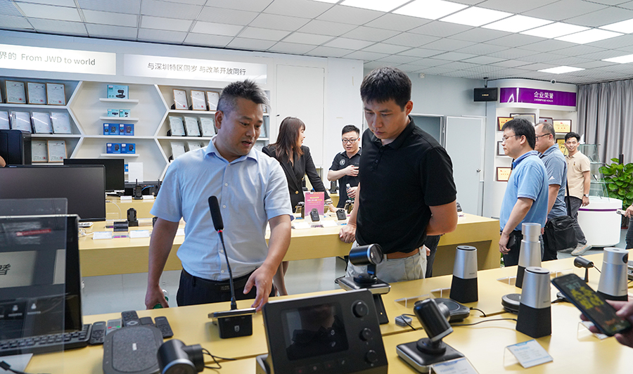 隨后,樂益群陪同馬立潮一行參觀京華產品展覽廳和體驗廳。樂益群向嘉賓們詳細介紹了京華音視頻產品的發展與變遷,并重點介紹了遠程通訊設備、會務通等產品的研發及產銷情況。雙方進行了深入交流,分享了各自主要業務和優勢服務,在交流中了解各自優勢和供需求關系,尋求合作商機。