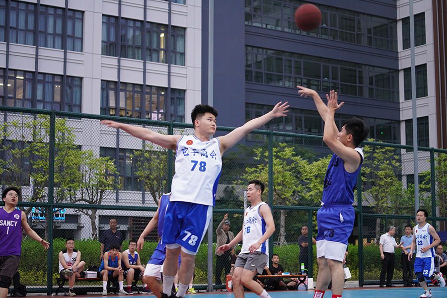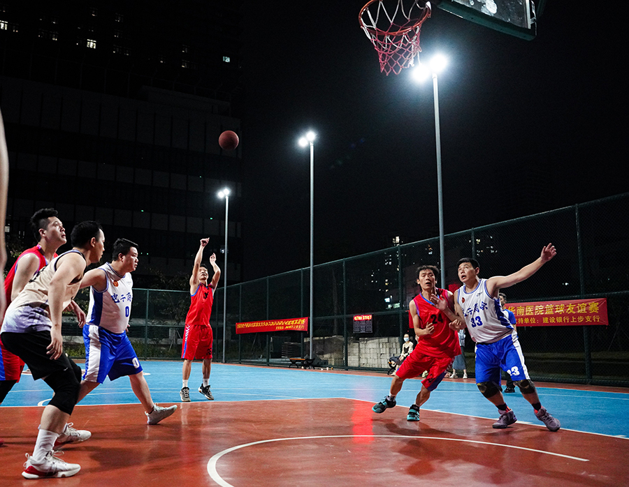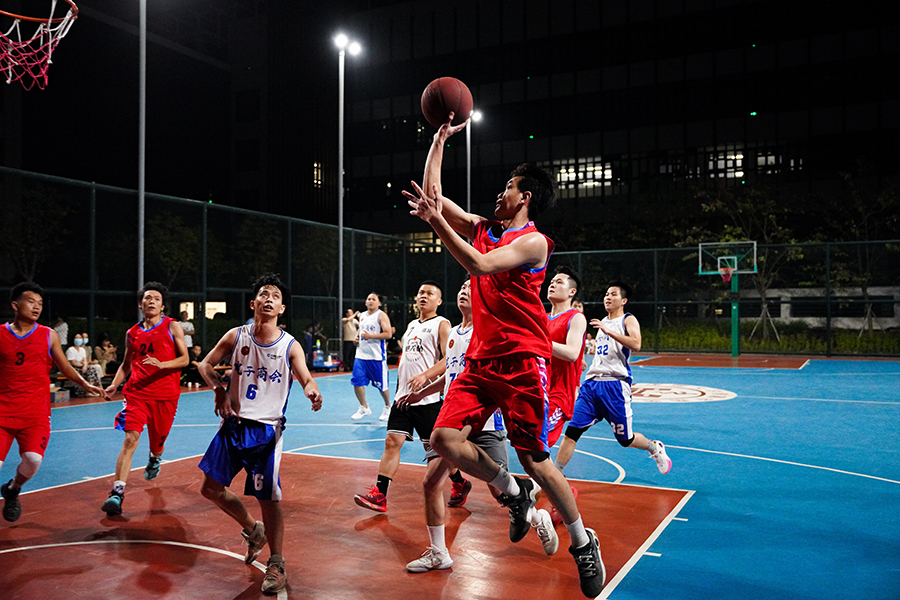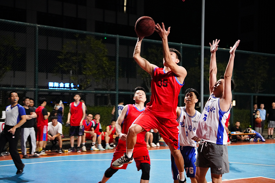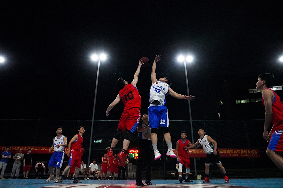 下午6時許,京華公司與電子商會、深圳大學附屬華南醫院的籃球友誼賽正式拉開序幕。隨著裁判員的一聲哨響,雙方球員聞令而動、奮力一躍,為爭奪球權拼盡全力。
