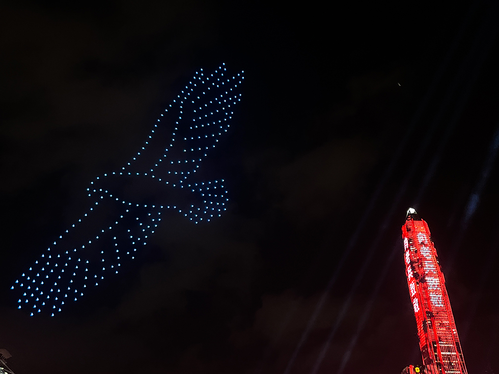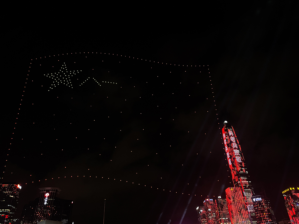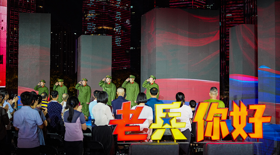 夜幕降臨,軍號響起,儀仗兵向老兵致敬。市民中心廣場周邊的樓宇建筑瞬間被耀眼奪目的燈光點亮,“老兵你好”“向老兵致敬”等宣傳標語映紅天際。千部無人機騰空而起,在夜空中靈動飛舞,先后編排出改革開放45周年、大鵬展翅、軍號、八一軍旗等造型畫面與市民中心廣場絢麗的舞臺交相輝映。參加節目錄制的老兵們身著戎裝,與市民群眾共賞這場光影盛宴。